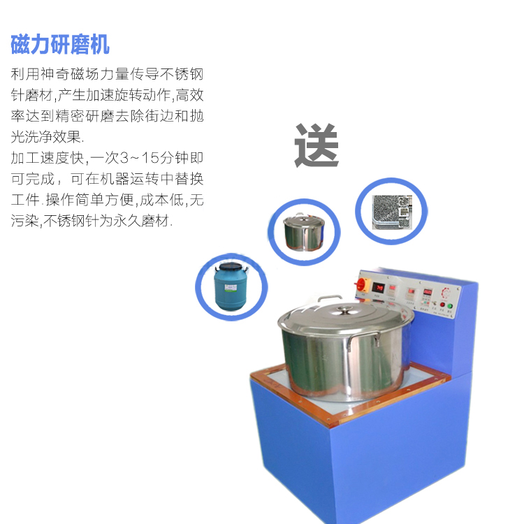 磁力研磨機是利用磁場氣力傳導不銹鋼針磨材產生快速旋轉運動,高效率達到往除毛邊、拋光、洗凈等精密研磨效果。