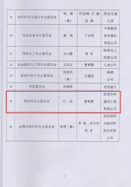大會宣布了陜西省金屬學會成立的16個專業委員會及掛靠單位名單,華邦建設被選定為鋼結構專業委員會掛靠單位,公司總經理行礎擔任主任委員,公司副總曹青霞擔任副主任委員。