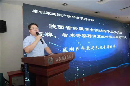 蓮湖區科技局袁展鋒局長發表致辭,他首先對授牌儀式及首批入庫專家表示祝賀,他指出,本次活動是深入貫徹習近平總書記關于高質量發展重要指示精神,深入推動全省“三個年”活動和全市“八個方面”重點工作的具體體現,將進一步聚集鋼結構行業創新資源,充分發揮科技創新帶動作用,促進解決技術瓶頸,提升鋼結構產業鏈水平。他還強調,2023年是全面貫徹落實黨的二十大精神的開局之年,是實施“十四五”規劃承前啟后的關鍵之年,是西安獲批建設綜合性科學中心和科創中心的起步之年,蓮湖區科技局將圍繞西安“雙中心”建設,依托秦創原科創服務平臺,以助企服務為核心,積極搭建產學研合作平臺,提高科技成果就地轉化和產業化水平,推動產業技術變革和優化升級,助力企業技術產業水平不斷提升。