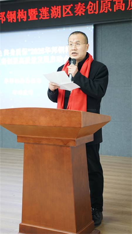 省金屬學會鋼構專委會主任委員、華邦鋼結構總經理行礎致辭,他首先代表鋼構專委會及華邦鋼結構全體員工,向蒞臨現場的各位嘉賓、各位業界上下游同仁致以最熱烈的歡迎和最誠摯的感謝!他提到, 2月7日,西安市委市政府召開了推動經開區2025年高質量發展工作專題會議,這與今天的啟動會非常契合,使我們更能堅定信心、鼓足干勁,為全市高質量發展貢獻自己的力量。他表示,自2003年成立以來,華邦鋼結構始終秉持“質量領先,終身質保”的核心理念,深耕鋼結構領域,累計完成超百項標志性工程。2025年是華邦鋼結構深化戰略合作、推動技術升級的關鍵之年,公司將以“質量創品牌,安全靠預防”為方針,聚焦技術升級、服務深化、文化凝聚三大方向,推動鋼結構智能化技術應用,優化“終身質保”服務體系,踐行“上善若水 天地人和”的企業文化,打造專業、高效、擔當的上下游一體化服務平臺。同時,作為陜西省金屬學會鋼結構專委會主任單位,華邦將持續聯合智庫專家,推動裝配式建筑、光伏一體化等九大領域的創新應用,還將參與發起既有建筑改建之檢測鑒定設計施工一站式聯盟,助力行業可持續發展。