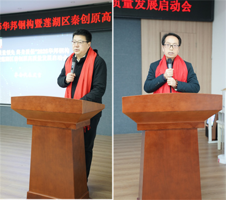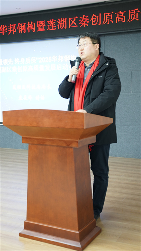 蓮湖區科技局局長袁展鋒在講話中指出,華邦鋼結構作為我省鋼結構行業的標桿企業,始終堅持科技創新,注重產品質量,為蓮湖區經濟社會發展做出了積極貢獻。蓮湖區作為西安市中心城區,始終把科技創新作為推動高質量發展的核心動力。近年來,蓮湖區大力實施創新驅動發展戰略,不斷優化創新生態,集聚創新資源,培育創新主體,全區科技創新能力顯著提升。袁局長希望華邦鋼結構以此次啟動會為契機,堅持創新驅動,加大研發投入,加強核心技術攻關,不斷提升產品質量和核心競爭力,努力打造國內一流、國際知名的鋼結構品牌。