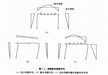 當把一個框架轉換為一個剛性框架時,其主要目的是為了保證側向穩定,剛性框架對豎向荷載的反應不可避免地改變了。在圖7.1 (a)所示框架中,豎向荷載作用于梁上時,柱(穩定或不穩定)僅承受豎向軸向壓力,當柱與梁連接產生剛性框架作用時,柱還承受彎曲。豎向荷載和側向荷載共同作用下框架作用如圖7.2 (c)所示。
