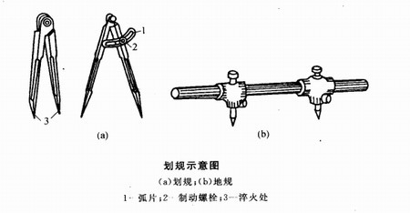 地規用于劃較大及大圓弧。它的兩個規頭可以卸下,并根據所劃半徑大小,用制動螺栓調節半徑距離。其操作方法與劃規相同,但劃較大半徑圓弧線時,需兩人配合進行。