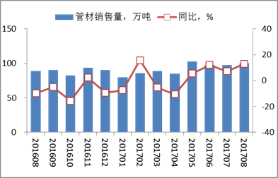 本月,重點鋼鐵企業銷售管材100.04萬噸,比去年同期增加11.39萬噸,上升12.84%;截止本月,本年累計銷售管材737.64萬噸,累計比去年同期增加23.62萬噸,上升3.31%。