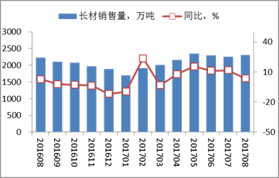 本月,重點鋼鐵企業銷售長材2307.70萬噸,比去年同期增加77.89萬噸,上升3.49%;截止本月,本年累計銷售長材16982.52萬噸,累計比去年同期增加1141.08萬噸,上升7.20%。