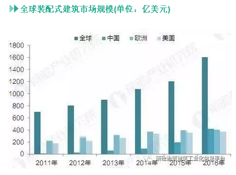 數據顯示,2016年全球裝配式建筑市場規模約1600億美元,其中歐美地區為主要市場,合計占比高達46.1%,雖然我國裝配式建筑起步較晚,至今不過十幾年的發展歷程,但自2013年以來,行業在政策的推動下,進入了快速發展的階段,2016年中國裝配式建筑市場規模超過400億美元,較2015年增長3.92倍。