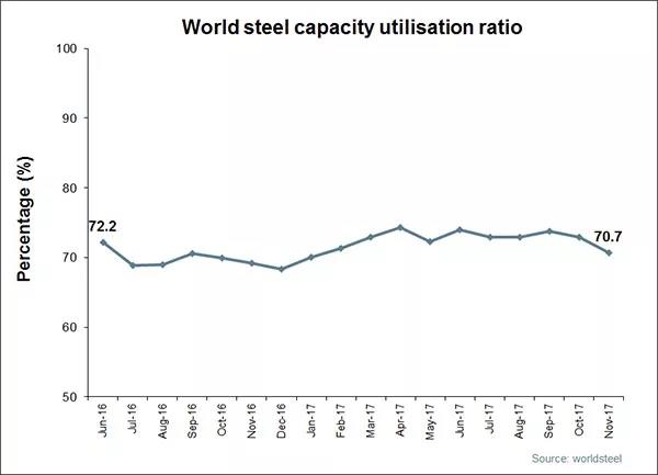 2017年11月全球66個納入世界鋼鐵協會統計國家的粗鋼產量為1.363億噸,同比提高3.7%;粗鋼產能利用率為70.7%,同比提高1.5個百分點,環比下降2.2個百分點。