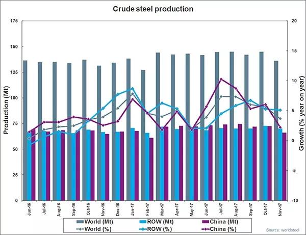 2017年11月中國粗鋼產量為6620萬噸,同比提高2.2%。日本11月粗鋼產量為870萬噸,同比提高1.0%。