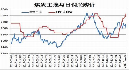 2017年,國內(nèi)焦炭期現(xiàn)貨價格走勢大起大落,但相較于年初重心繼續(xù)上移,由于環(huán)保安全檢查使得焦化行業(yè)的開工受到限制,從而造成貨源供應(yīng)出現(xiàn)階段性偏緊局面。特別是進(jìn)入6月份,鋼鐵行業(yè)清除地條鋼效果明顯,利好刺激下鋼材價格扶搖直上,高利潤驅(qū)動下鋼廠開足馬力生產(chǎn),原料需求旺盛,焦炭價格持續(xù)攀升,焦炭期貨指數(shù)于8月29日創(chuàng)出年內(nèi)新高2493元/噸,相較于6月份低點(diǎn)1365.5元/噸,漲幅超80%。但隨著鋼廠及焦化廠庫存大增,焦炭價格大漲明顯透支需要紅利,于9月中旬至10月底出現(xiàn)一波35%深度回調(diào)。據(jù)統(tǒng)計數(shù)據(jù)顯示,天津港準(zhǔn)一級冶金焦由年初2190漲至2017年底2495,漲幅達(dá)14%。