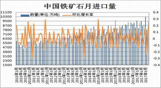 2017年1-11月中國鐵礦砂及其精礦進(jìn)口量為99127萬噸,與去年同期相比增長6%。特別是9月份我國進(jìn)口鐵礦砂及精礦環(huán)比上漲近16%,達(dá)到10283萬噸,創(chuàng)歷史新高。