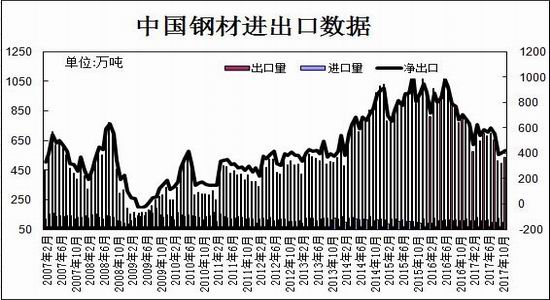據(jù)海關(guān)總署公布的數(shù)據(jù)顯示,2017年1-11月份我國鋼材進(jìn)口量為1210萬噸,1-11月鋼材出口量為6996萬噸,1-11月份鋼材凈出口量為5786萬噸,去年同期凈出口量為8918萬噸。2017年鋼材出口量持續(xù)萎縮,一方面是歐美等發(fā)達(dá)國家頻繁針對中國進(jìn)行“雙反”調(diào)查,另一方面則是國內(nèi)鋼材價格堅挺出口優(yōu)勢不明顯。