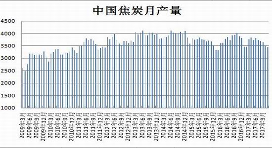 2017年煤炭行業(yè)調(diào)控政策已經(jīng)由2016年的“去產(chǎn)能,限產(chǎn)量”逐漸調(diào)整為“保供應(yīng),穩(wěn)煤價”,因此煉焦煤產(chǎn)量相較于2016年同比出現(xiàn)增長,但仍低于2015年產(chǎn)量。而2017年由于粗鋼產(chǎn)量同比增加對于焦炭需求增速明顯提高,受環(huán)保限產(chǎn)影響焦化廠供給端卻同比出現(xiàn)下滑,據(jù)統(tǒng)計數(shù)據(jù)顯示,2017年1-11月份國內(nèi)焦炭產(chǎn)量為40048萬噸,同比下降2.2%,從月產(chǎn)量分析,焦炭產(chǎn)量受環(huán)保政策及鋼廠需求變化而變。其中1-2月份及四季度焦炭產(chǎn)量分別受需求淡季及采暖季限產(chǎn)影響,平均月產(chǎn)量在3500萬噸之下,而其余月份產(chǎn)量均在3650-3800萬噸區(qū)間,因鋼價走高粗鋼產(chǎn)量高企,焦化廠利潤回升開工率逐步上移。