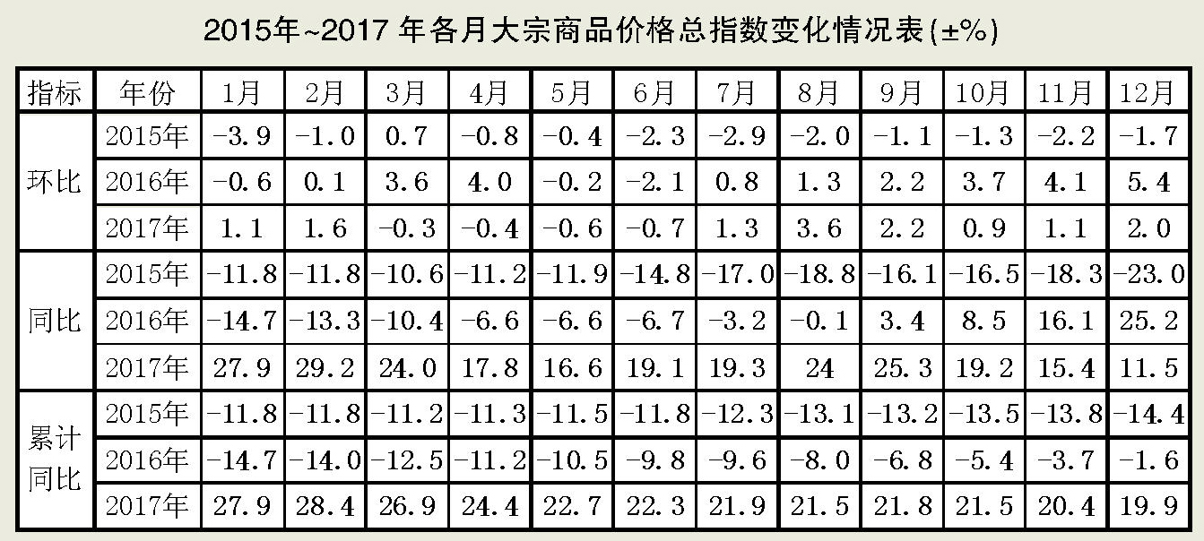 2017年12月份,國內(nèi)經(jīng)濟運行平穩(wěn),大宗商品市場需求增加,供應持續(xù)下降,供需銜接基本正常。綜合來看,當前國內(nèi)大宗商品市場基本回歸穩(wěn)中趨升的運行態(tài)勢。2017年12月份,大宗商品價格繼續(xù)上漲,環(huán)比上漲2.0%,漲幅較2017年11月份擴大0.9個百分點,顯示出大宗商品價格整體處于上升通道中;同比上漲11.5%,漲幅收窄3.9個百分點。2017年,大宗商品累計平均價格同比上漲19.9%,比2017年初上漲4.0%。