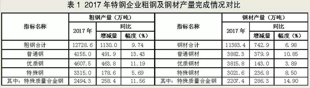 2017年特鋼企業粗鋼及鋼材產量完成情況對比如表1所示。