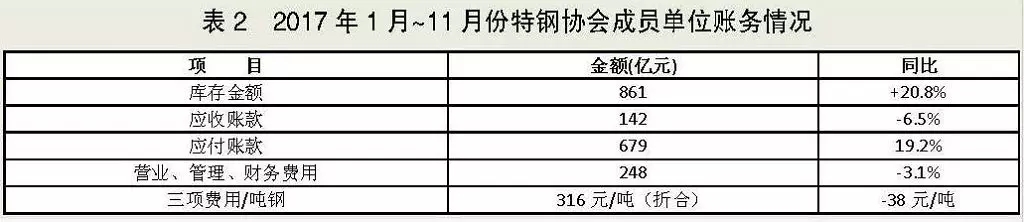 王懷世表示,2017年特鋼企業經營管理狀況有所改善,資金壓力略有減輕。2017年1月~11月份特鋼協會成員單位財務情況如表2所示。