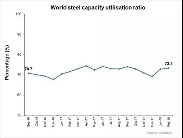 2018年2月全球64個國家的粗鋼產能利用率為73.3%,同比提高1.8個百分點,環比提高0.5個百分點。