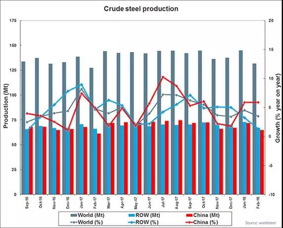 2018年2月全球64個納入世界鋼鐵協會統計國家的粗鋼產量為1.318億噸,同比提高3.5%。