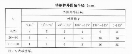 4、小壁厚、內(nèi)外圓角半徑需要根據(jù)鑄鋼件輪廓尺寸、夾角和鑄造工藝確定,可以按下圖來確定。
