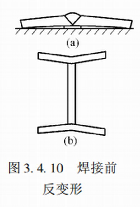 2、采用反變形法減小焊接變形或焊接應力。事先估計好結構變形的大小和方向,然后在裝配時給予一個相反方向的變形與焊接變形相抵消,使焊后的構件保持設計的要求,例如下圖3.4.10所示為焊前反變形的設置。