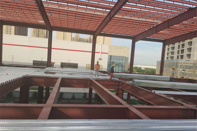 隆基樂葉鋼結構廠房梁柱節點焊接與樓承板鋪設