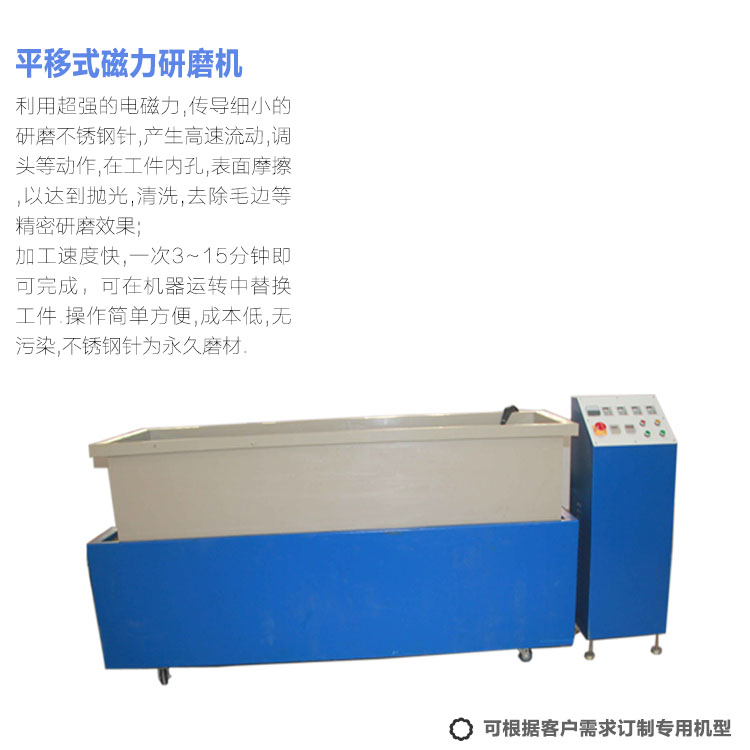 是在原來的普通磁力研磨機的基礎上,增加2-3個機組磁場左右移動,大大改善了整個拋光的均勻度,產品在研磨桶內無盲區,特別是磁盤中心及四周圍位置。